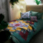 Sticking with a cosy theme, I chose a velvet bias binding to finish the edges of the quilt. I used a forest green colour to blend in with the teal border. This was sewn on last.